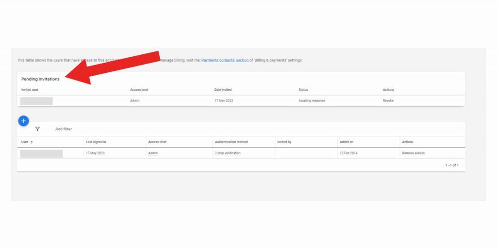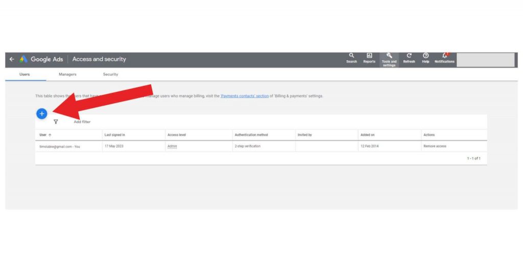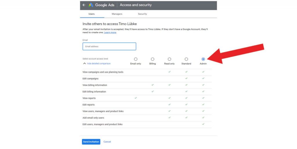 3. Klicke dann auf das blaue Plus-Zeichen und du kommst auf eine Seite, wo du die E-Mail-Adresse der Agentur eingeben musst. Außerdem kannst du auswählen, welche Berechtigungen du der Agentur geben möchtest. In den meisten Fällen ist das „Admin“.